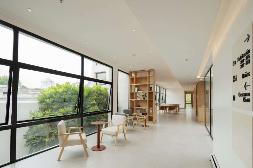 Ofrecemos habitaciones privadas y compartidas, espacios únicos con jardines y galerías luminosas, biblioteca y una confitería exclusiva para residentes y familiares, donde priorizamos la comodidad y la accesibilidad en un entorno cuidado que invita al encuentro.